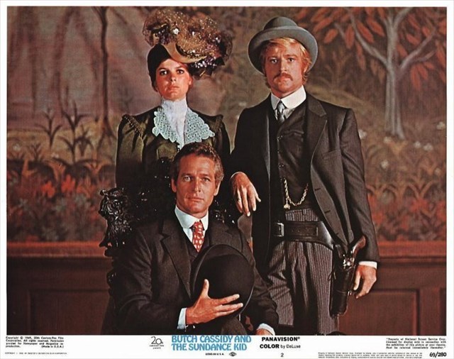 This movie was filmed roughly the same time as Hello, Dolly!, on the sound stage next door. Director George Roy Hill believed that the studio would allow him to film the New York scenes on "Dolly's" sets, since the two films' daily shooting schedules were totally different. After production started, though, the studio informed him that it wanted to keep the sets for "Dolly" a secret and so refused him permission. To work around this, Hill had Robert Redford, Paul Newman and Katharine Ross simply pose on the sets and took photos of them. He then inserted images of the three stars into a series of 300 actual period photos and spliced the two different sets (real and posed) together to form the New York montage.