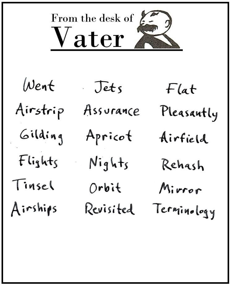 Vater's pen raced. "Went.... Jets.... Flat...." he muttered. Sohn frowned and abruptly set down his cup and book. At those three words something in him stirred, a faraway and forgotten memory. He walked behind Vater and looked over his shoulder at the paper. "Say, Vater, did you say 'magic words'? You're not making much sense. And yet..."