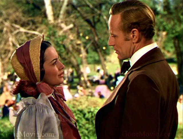 To portray Melanie, Olivia de Havilland spent most of the film in drab, dowdy costumes. She wore 2 elaborate dresses in the film: one when Melanie and Ashley announce their engagement, and a striking blue taffeta dress that Melanie wears to Scarlett's first wedding. Unfortunately, due to film aspect ratio at the time (long before the advent of widescreen), the screen could not accommodate two dresses built up with hoop skirts, so they had to be removed. Thus, de Havilland's rare appearance in a beautiful dress was shot from the waist up, with the skirt hanging limp.